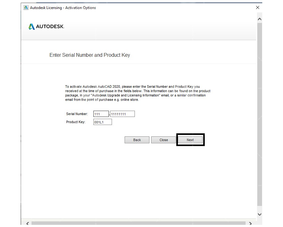 Bước 3: Các bạn nhớ để ý khi chạy đến chỗ nhập số Serial thì nhập dãy sốlà 666-69696969 hoặc 111-11111111, Prosuct Key là 001L1 xong thì nhấn chữ Next.