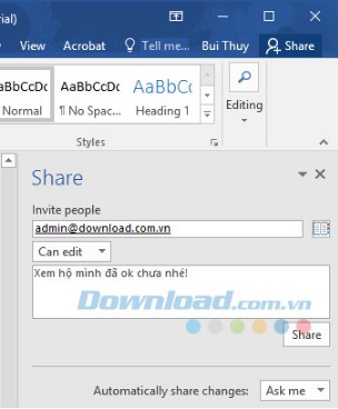 Nhập email người muốn chia sẻ, cấp quyền, nội dung chia sẻ, nhấn Share.