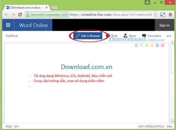 Nút Share ở góc trên bên phải chia sẻ tài liệu Office với người dùng khác.