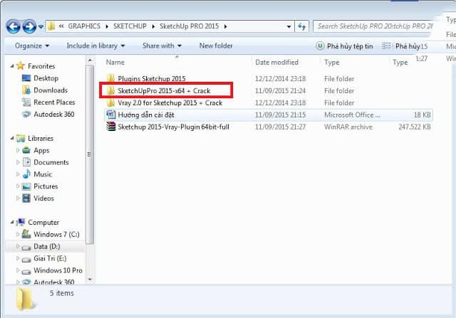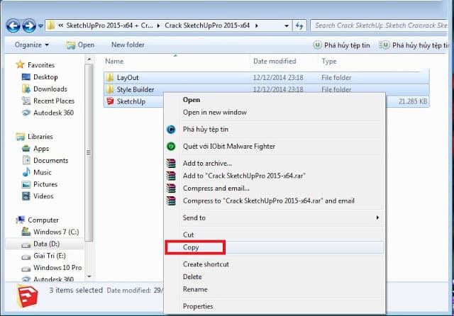 B8: Sau đó thì bạ hãy vào thư mục SketchUpPro 2015-x64 + Crack lúc nãy rồi thì hãy bấm vào thư mục Crack SketchUpPro 2015-x64, sau đó copy hết tất cả các file trong đó