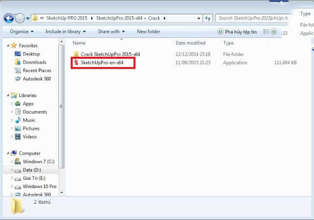 B2: Tiếp theo thì bạn hãy vào thư mục SketchUpPro 2015-x64 + Crack => file SketchUpPro-en-x64.exe: xem hình nhé, quá trình khởi động cài đặt đã được bắt đầu.