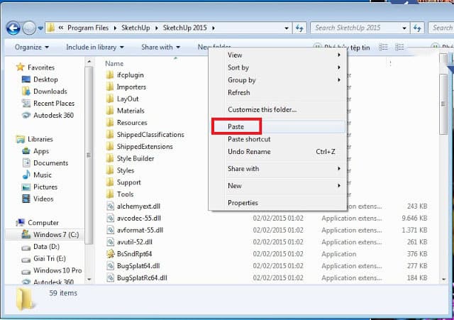 B9: Bạn hãy Paste file vừa copy vào thư mục cài đặt Sketchup 2015 mặc định là C:\Program Files\SketchUp\SketchUp 2015 xem hình kèm theo bên dưới