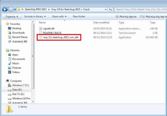 B1: Đầu tiên thì vào thư mục Vray 2.0 for Sketchup 2015 + Crack Chạy file vray 2.0_sketchup_2015_win_x64 xem hình bên dưới nhé
